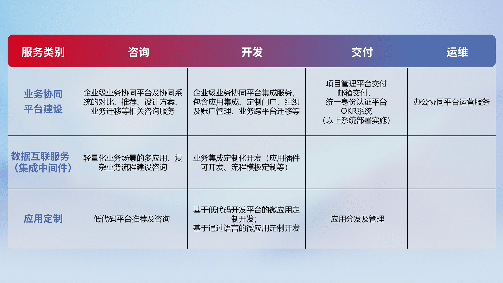 针对钉钉、、企微、、、、IDaas等平台级产品提供产品的规划、、方案、、、、交付、、、定制化开发等服务,,实现如统一协同办公、、、、智能客户服务、、混合会议管理、、智能数据查询、、、等业务场景,,,实现数字化转型。。。